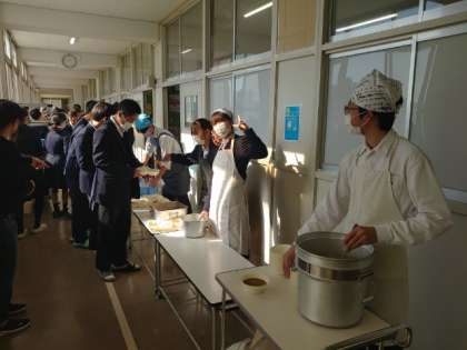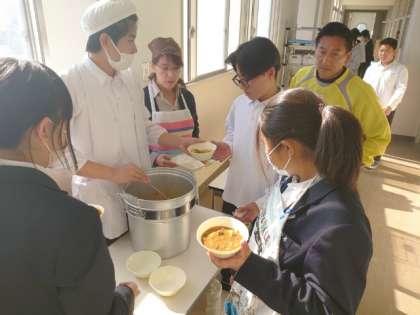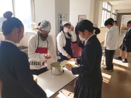 お昼休みのチャイムが鳴り、2年生の教室前で給食の準備が始まりました。今日は「えびフライカレー・カリフラワーのピクルス・煎り黒豆」の人気メニュー。皆さん、白いご飯にカレーをたっぷりかけていただいてくださいね。
