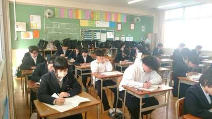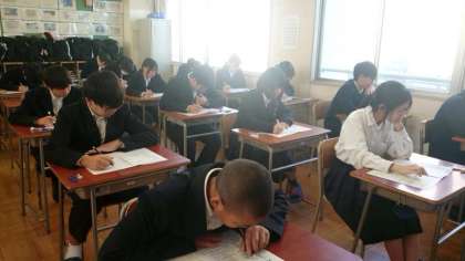 2時間目は2年生で英語のテストが行われています。先生が放送室からリスニングテストの問題を流します。各教室では、皆さんが耳を澄ませて聞き取ります。比較級に関する英会話が流れていますね。皆さん、しっかりと聞き取れましたか?