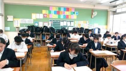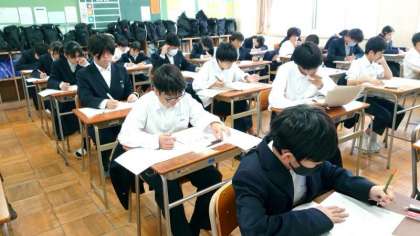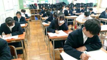 1時間目のテストが始まりました。1年生の皆さんが英語のリスニングテストを受けています。問題用紙のイラストを見て、英語の質問に答えるタイプの問題です。スピーカーから流れる音声を聞き逃さないよう、集中力を高めましょう。