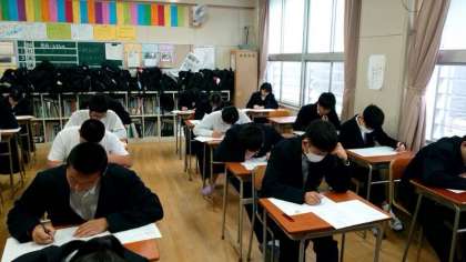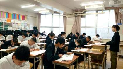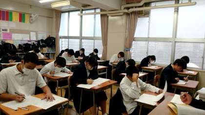 3年生の皆さんが社会科のテストを解いています。全部で90問あるので、解き進めるスピードも必要です。基本的人権や国会の仕組みなど、出題範囲も幅広そう。テスト前に見ていた内容が出ているでしょうか?