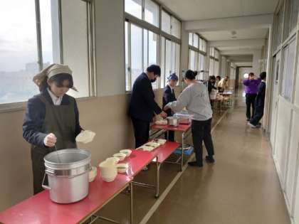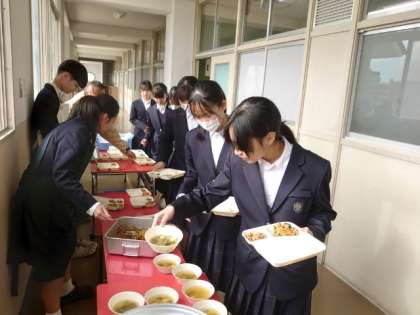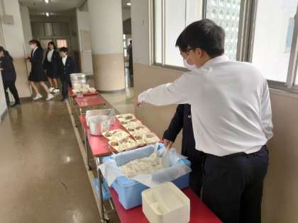 お昼休みのチャイムが鳴り、1年生の教室前で給食の準備が始まりました。今日は「ピビンパ・ワカメスープ」の韓国風献立です。ごま油の風味が香るピビンパはとても美味しそう。もしよければ、ご飯のお代わりもしてくださいね。