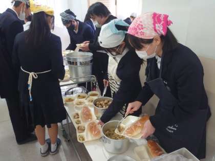 お昼休みのチャイムが鳴り、3年生の皆さんが給食の準備を進めています。今日のメニューは「焼き焼売・ツナと野菜のオイスターソース炒め・鶏と野菜の中華スープ」です。実力テストも後は社会科を残すのみ。皆さん、もうひとふんばり頑張りましょう!