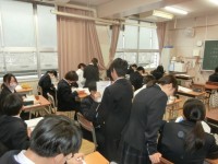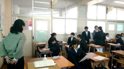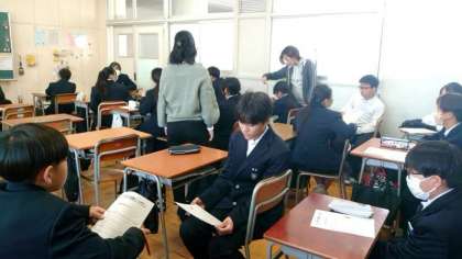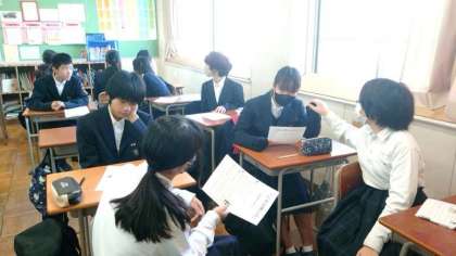 1年生道徳の授業でソーシャルスキルトレーニングを体験します。より良い対人関係を築くために心がけたい点を教わります。相手を誘う時には「相手の目を見て、笑顔で、優しく、聞こえる声」を心がけるのが、肝心だそうです。皆さんも一度試してみましょう。