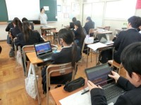 図書室から2年生の皆さんの歓声が聞こえてきました。国語科で「百人一首」の稽古をしているようです。先生が上の句と下の句を1回ずつ読む中、皆さんが出札を見つけます。1月に百人一首大会があるそうですよ。冬休みに練習してくださいね。
