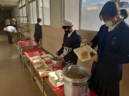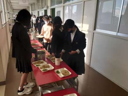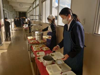 午前中の授業が終わり、お待ちかねの給食の時間。1年生の皆さんが配食準備を進めています。今日は「和風焼きそば・キュウリの生姜漬・ソフト黒豆」の人気メニュー。和風焼きそばは、醤油の香ばしい香りが美味しそう。どうぞ、お代わりしてくださいね。