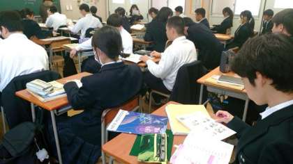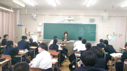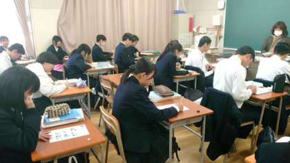 3年生英語の授業でリスニングの練習が行われています。教室に英語の音声が流され、前もって配られた問題プリントを解いていきます。繰り返しいろんな問題に取り組むと力が付くそうです。皆さん、コツコツと努力を重ねましょう。
