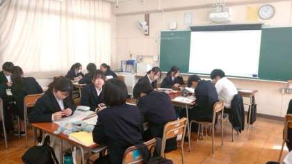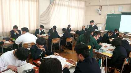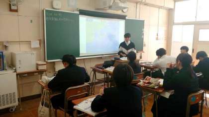 2年生理科の授業で、明日の天気を予想します。天気図の気圧配置をもとに、天気がどのように変化するかを班毎に話し合います。予想した理由もしっかりと考えてくださいね。