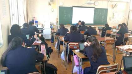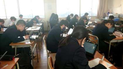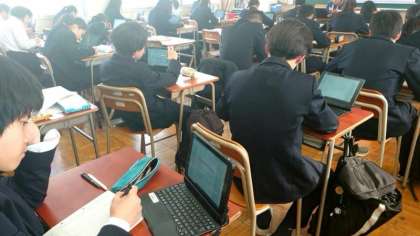 2年生英語の授業でタブレット端末を使って学習しています。先生から配信された問題をそれぞれが解いていきます。来年の全国学力調査の理科のテストでは、タブレット端末を使ってテストが実施されます。今から使い方に慣れてくださいね。