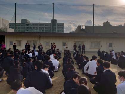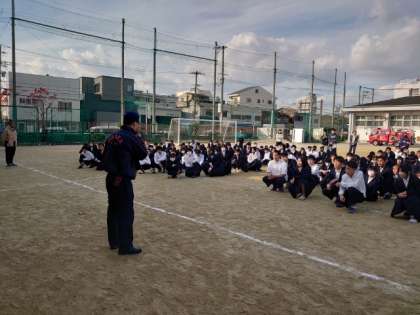 避難が完了後、生野消防署の方々からご講評をいただきました。避難時に迅速に行動できていた点や、昨年よりも避難時間が短くなっている点について、褒めてくださいました。皆さんの頑張りを評価してくださって良かったですね。