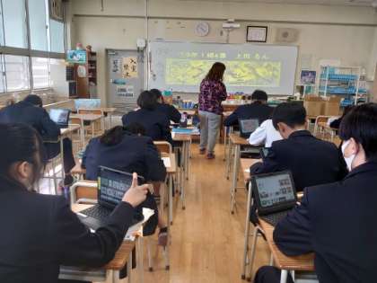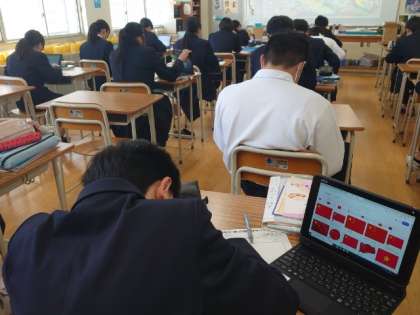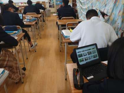 2年生美術の授業で「絆の旗」のデザインを考えています。姉妹校の上海市甘泉外国語中学との友好を表し、両校に飾る旗のデザインをタブレット端末を使って調べます。パンダの写真やイラストを検索する人が多いようです。やはり人気がありますね。