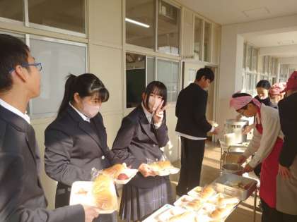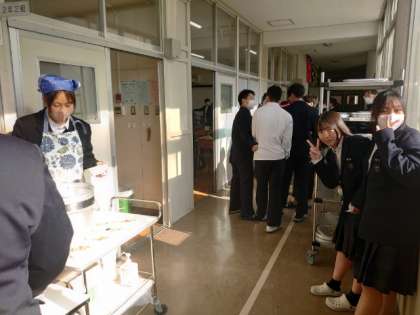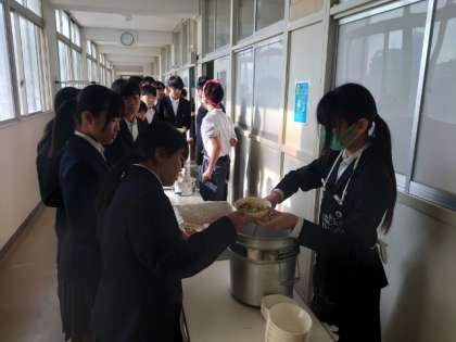 お昼休みのチャイムが鳴り、2年生の皆さんが給食の準備中。火曜日は「鮭のマリネ・肉団子と押し麦のスープ・リンゴ」の洋食メニュー。カラッと揚げた鮭を、お酢やワイン、オリーブ油に漬けこんだマリネは、さっぱりしたお味です。追加が欲しい人はぜひどうぞ。