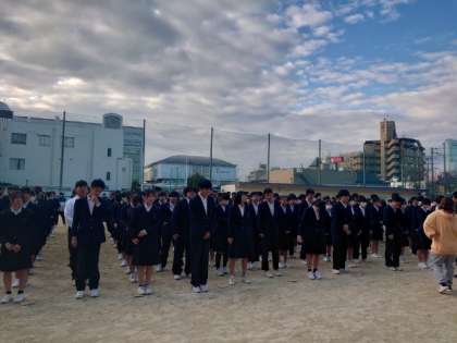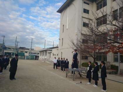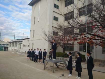 月曜の朝は全校集会。今朝は生徒会各委員会の代表から月間目標の発表がありました。年末年始を前に、健康面や生活面で気をつけたい点を呼びかけます。良い冬休みになるよう、互いに気をつけましょう。