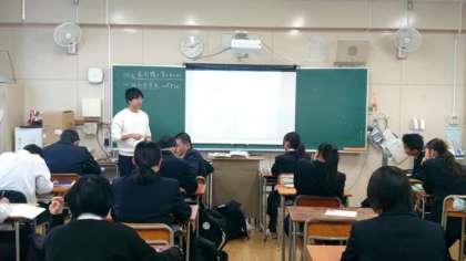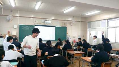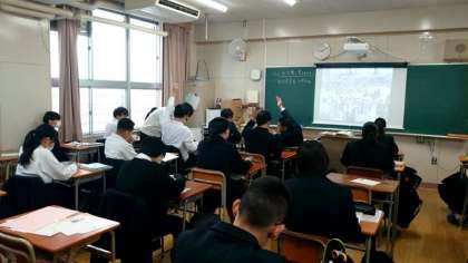 3年生社会科の授業で写真資料について考えます。スクリーンには昔の日本のある光景を写した写真が映されています。皆さん、何の光景かを考えて、答えがわかったら手を上げて回答します。資料をよく見るとヒントが見つかります。皆さん、わかったでしょうか?