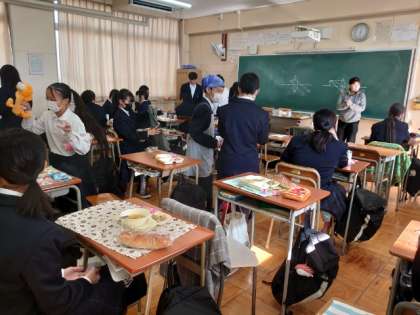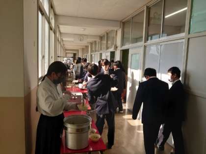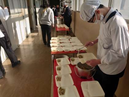 午前の授業が終わり、1年生の教室前で給食の準備が進んでいます。今日は「豚と野菜のソテー・鶏と野菜のスープ・カレーフィッシュ」の洋風メニュー。白ワインで下味を付けた豚肉は香りが良さそう。パンと一緒にいただいてくださいね。