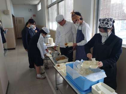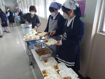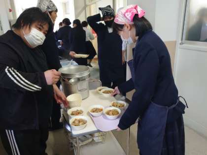 お昼休みのチャイムが鳴り、3年生の皆さんが給食の準備を行っています。今日は「キビナゴの天ぷら・豚と根菜の煮物・焼きカボチャ」の和風献立。冬至に「ん」が付く食べ物をいただくと、運が良くなるそうです。カボチャは「なんきん」とも言い「ん」が2つもついていますね。