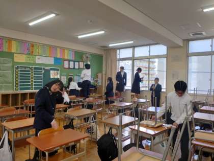 校舎3階では2年生の皆さんがお掃除を頑張っています。みんなと一緒に過ごした校舎に「ありがとう」の気持ちを込めながら教室・廊下をピカピカに磨き上げます。皆さんの頑張りで、とてもキレイになりますね。