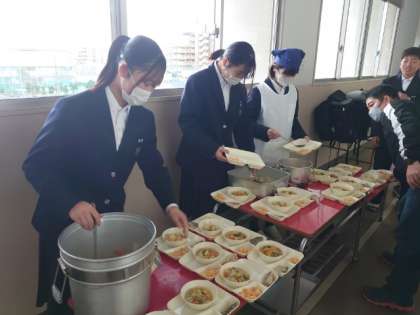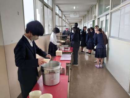お昼休みのチャイムが鳴り、1年生の教室前で給食の準備が始まりました。今年最初のメニューは「アジのレモンマリネ・豚と野菜のスープ・白桃」です。キャベツやニンジン、てぼ豆を煮込んだスープは身体が温まりそう。寒い日にぴったりの献立になりましたね。