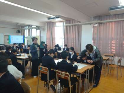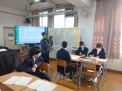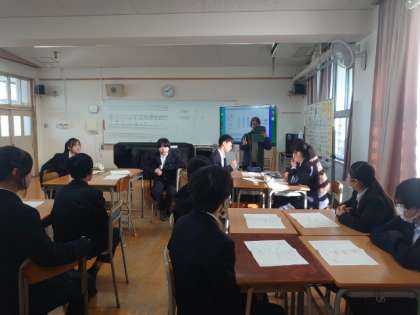 1年生音楽の授業でグループ毎に取り組んできた「テーブルクラップ」の発表が行われています。仲間と一緒に考えた作品のリズムを軽快に刻みます。みんなで演奏する共通リズムやソロで演奏するリズムなど、いろんな工夫が見られますね。
