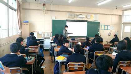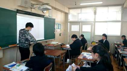 1年生社会科の授業で「チャレンジテスト」の問題を復習しています。先生が出題内容についてていねいに解説します。これまで習った内容ですが、忘れてしまった人もいる模様。今一度おさらいして、しっかりと定着させましょう。