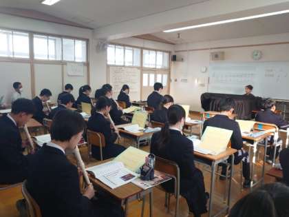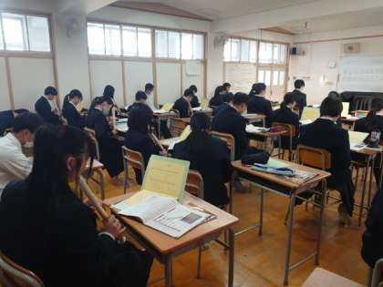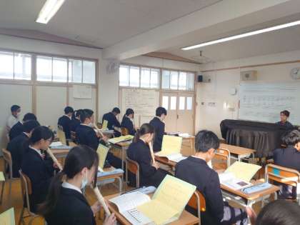 2年生音楽の授業でリコーダーの合奏に取り組みます。今日は唱歌「ふるさと」を演奏します。「兎追いし かの山 〜」で有名な文部省唱歌で、今から100年以上前に発表された曲だそうです。長きに渡って歌い継がれてきた楽曲をリコーダー合奏を通して味わってくださいね