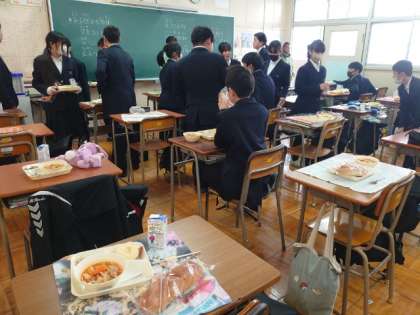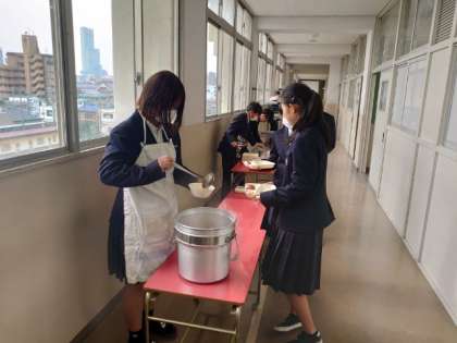 午前中の授業が終わり、1年生の皆さんが給食の準備を行っています。今日は「豚と根菜のケチャップ煮・ササミともやしのソテー・リンゴ」の洋風献立。デザートのリンゴはビタミンCなどの栄養素がたっぷり。皆さんの健康に良さそうですね。