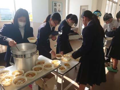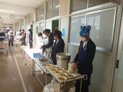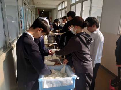 お昼休みのチャイムが鳴り、2年生の教室前で給食の準備が始まりました。今日は「サバのカレー竜田揚げ・豆腐と野菜の五目汁・キュウリの甘酢和え」の和風献立。カレー粉で下味を付けてサクッと揚がったサバの竜田揚げ。ビタミンたっぷりのサバは健康に良いそうですよ。