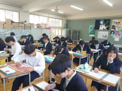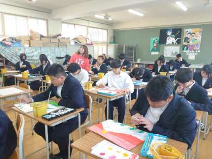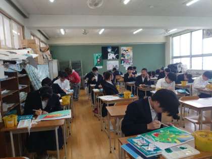 2年生美術の授業で制作している「遠近感のある平面構成」。作品の下書きが出来上がり、水彩絵の具を使って着色する工程に入っています。色を塗ると、作品が一気に華やかに感じます。皆さん、徐々に仕上がりが見えてきましたね。