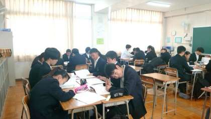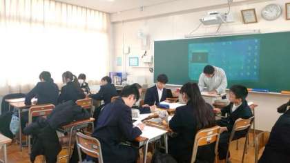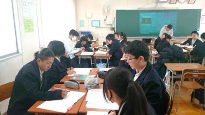 2年生英語の授業で先日実施されたチャレンジテストのおさらい中。今日はグループになってテスト問題を解いていきます。お互いに教え合いながら学習内容の定着をめざします。間違えた問題は繰り返し見直してくださいね。
