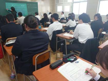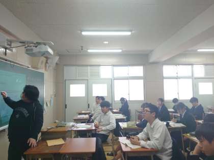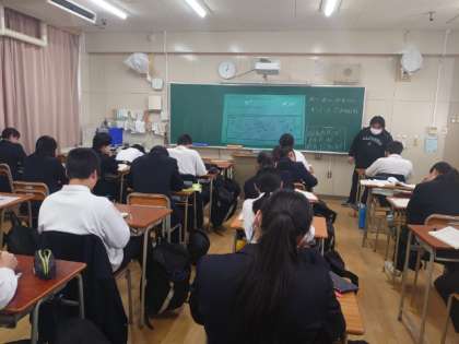 3年生数学の授業で「三平方の定理」を使って問題を解いていきます。直角三角形で、「斜辺の長さの2乗は他の2辺をそれぞれ2乗した数の和に等しくなる」とのこと。直角三角形では2辺の長さがわかると、もう1辺の長さも計算できますね。皆さん、この定理を使って、問題を解きましょう。