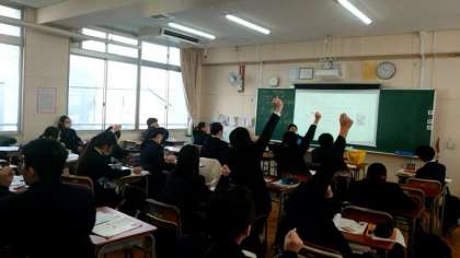 2年生英語科で「受動態 (受け身) 」を学習します。「この製品は日本で作られています」など、「〜されています」という受け身の状態を表す文法です。「主語+be動詞+過去分詞」で受動態になるとのこと。皆さん、一度英文を作ってみましょう。