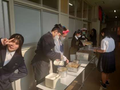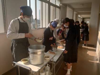 午前の授業が終わり、2年生の皆さんが給食の準備を行っています。今日のメニューは「鶏の唐揚げ・ハムと野菜の中華スープ・もやしとコーンの中華和え」。サクッと揚がった鶏の唐揚げは人気がありますね。追加をお願いする人もいるようですよ。
