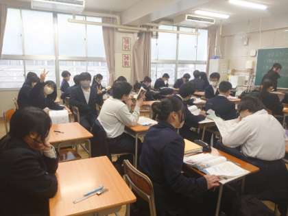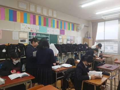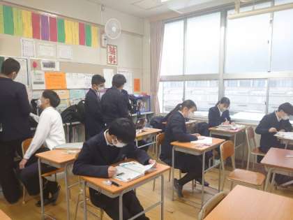 今日から3日間、3年生学年末テストを行います。テスト開始前の教室では、皆さん学習内容の確認を進めているようです。中学校生活最後の定期テストです。悔いが残らないよう、頑張りましょう。