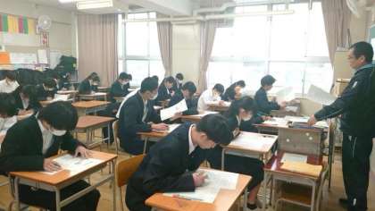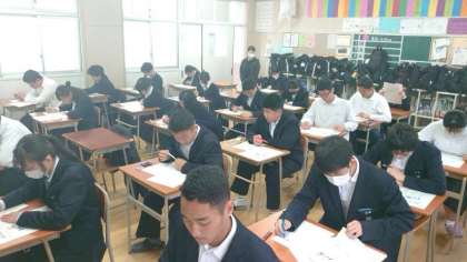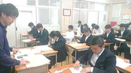 テスト2時間目。英語のテストが行われています。開始後しばらくすると、スピーカーから先生の声が聞こえてきました。恒例のリスニングテストです。問題は2回流れるので、しっかりメモをとって、ケアレスミスを防ぎましょう。