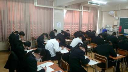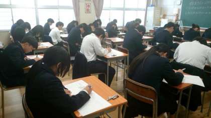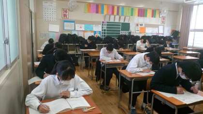 現在3年生の教室では、社会科のテストが行われています。地理・歴史・公民と、中学校で習った内容が幅広く出題されています。問題量もたっぷりなので、ペース配分を考えて、どんどん解いていきましょう。
