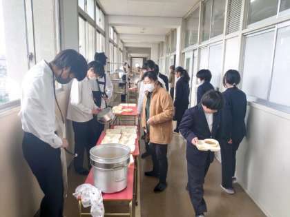 お昼休みのチャイムが鳴り、1年生の皆さんが給食の準備を行っています。今日は「ビーフシチュー・カリフラワーとコーンのサラダ・カレーフィッシュ」の洋風献立。今日のような寒い日にシチューはぴったりのメニューです。しっかりいただいて身体を温めてくださいね。