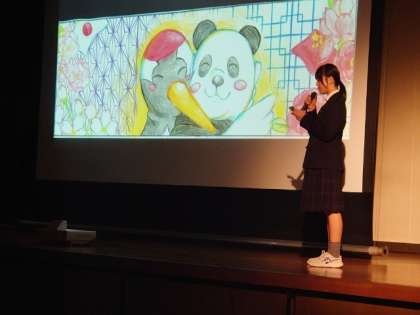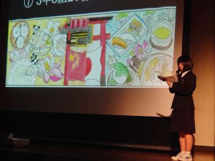 会場の体育館に全校生徒が集まる中、第1次選考で選ばれた代表者の皆さんが、デザインに込めた思いをお話します。いずれも姉妹校甘泉中学への温かい気持ちが感じられるスピーチばかりです。