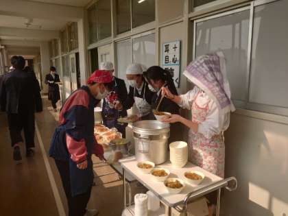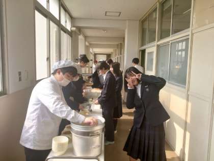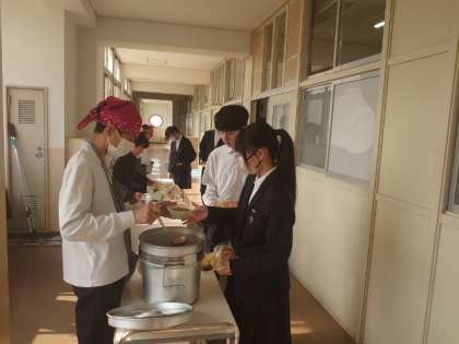 午前中の授業が終わり、2年生の皆さんが給食の配膳中。今日は「ミートボールと野菜のカレー煮・ツナと小松菜のソテー・パインアップル」の洋風メニュー。給食をいただいた後、いよいよ百人一首大会が行われます。しっかり食べて、決戦に備えましょう。