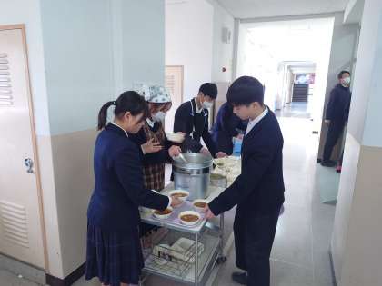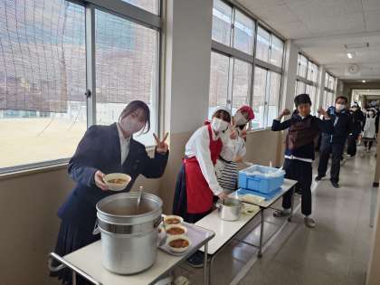 午前の授業が終わり、3年生の教室前で給食の配膳が始まりました。今日は「ハヤシライス・キャベツのひじきドレッシング・ミニフィッシュ」の人気メニュー。お肉と野菜をたっぷり煮込んだハヤシライスは今日のような寒い日にピッタリ。皆さん、温まってくださいね