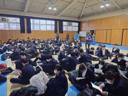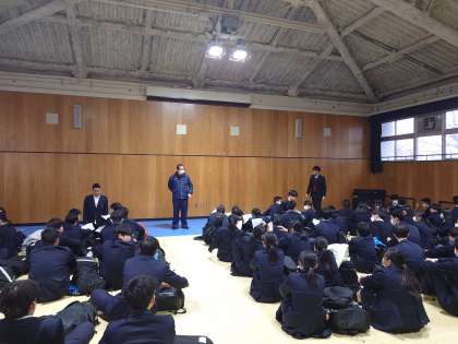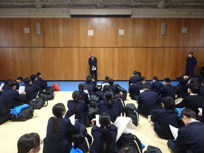 3年生の皆さんが武道場に集まってきました。これから私立高校入試に向けた諸注意が行われます。各高校の集合時間や行き方(経路)などの最終確認を行う予定。先生方から熱いエールが送られる中、入試当日の健闘を心から祈っています!