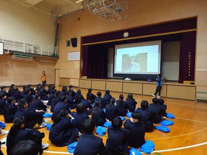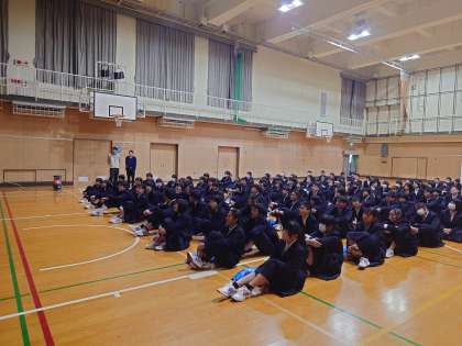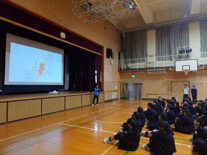 2年生の皆さんが体育館に集まり、修学旅行の説明を聞いています。行き先は長野県飯田市。南信州と呼ばれる豊かな自然の中で、さまざまな体験を行うそうです。実施日は、5月29日(木)〜31日(土)です。皆さん、今からワクワクしますね
