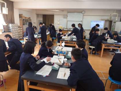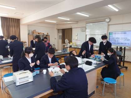 2年生の皆さんが理科室にやってきました。以前に教わった「電源装置」を使って実験を行うとのこと。電力の異なる電熱線に電流を流し、電力の大きさによって水温の上昇にどんな変化が起こるかを確かめます。皆さん、電源装置を上手く操作してデータを集めましょう。
