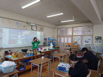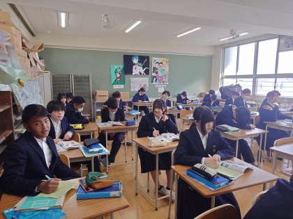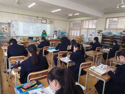 2年生美術の授業で、教科書を使ってこれまでの学習内容を振り返ります。先生が「さまざまな構図と遠近法」について解説してくださっています。来週の学年末テストに出題されるかも。皆さん、しっかりとチェックしておきましょう。