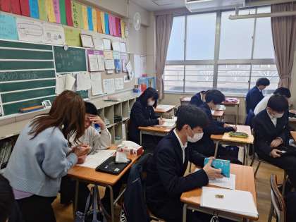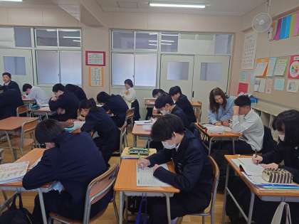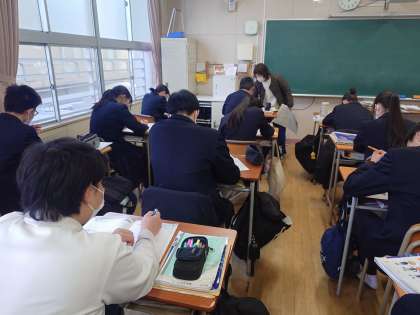 3年生英語の授業で個別指導が行われています。2名の先生が英文法などのわからない点に答えてくださいます。入試問題を元に質問する人もいる模様。弱点を克服する良いチャンスです。いろいろと尋ねてくださいね。