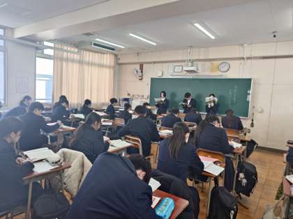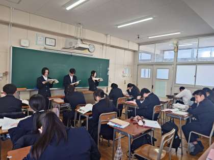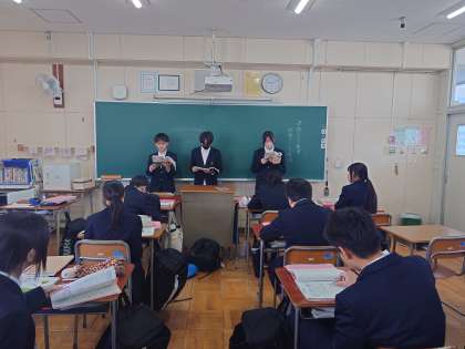 2年生国語の授業で「音読テスト」が行なわれています。走れメロスの1節を各グループが音読します。全員にシートが配られ、それぞれの発表を評価します。正しく読めたか・声の大きさ・表現力など、観点毎に点数をつけるとのこと。皆さん、真剣に各グループの発表を審査しています。