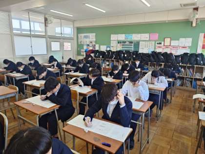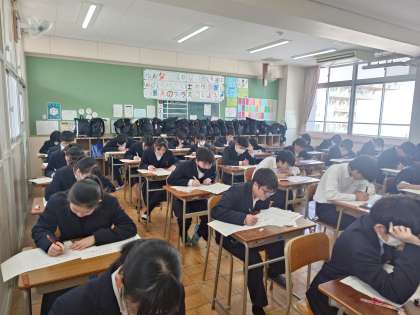 1年生の皆さんも社会科のテストを解き進めています。オーストラリアや南米などの世界の地理と、奈良や平安時代などの歴史分野から幅広く出題されている模様。歴史では写真資料もたくさんありますね。どの時代に関連するかを、よく思い出しましょう。