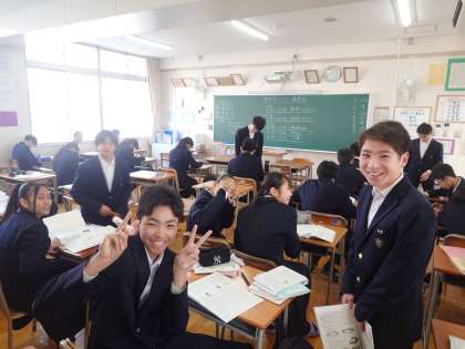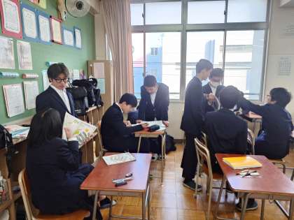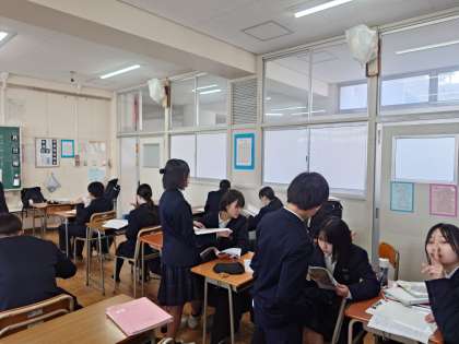 2年生の皆さんも、お互いに問題を出し合いながらテスト開始前の時間を過ごしています。この仲間と一緒にテスト勉強するのも最後になりました。4月からクラスは変わりますが、今の良い雰囲気を保ち続けてくださいね。