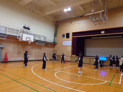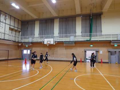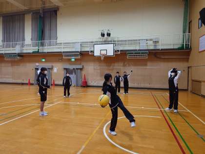 体育館では3年女子の皆さんが球技を楽しんでいます。バレーボールでパスやレシーブを練習するグループや、ソフトバレーボールを使ってパス回しを行うグループなどそれぞれのスキルに応じて取り組んでいます。ケガのないように、球技を楽しんでくださいね。