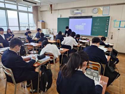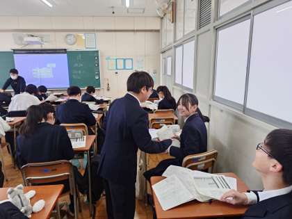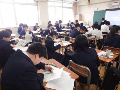 1年生社会科の授業で学年末テストの結果が返ってきました。それぞれ解答用紙が手渡されると、皆さん喜んだり悔しがったり、いろんな感情が交錯しているようです。次回に向けて心機一転頑張りましょう。