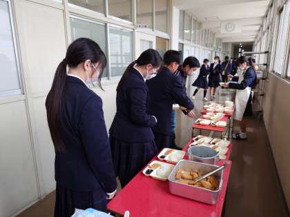 午前の授業が終わり、1年生の教室前で給食の準備が始まりました。今日のメニューは「いわしフライ・お味噌汁・牛ひじきのそぼろ」の和風献立。牛ひき肉とひじきを甘辛く炒めたそぼろはご飯に合いそうです。白ご飯に添えていただきましょう。