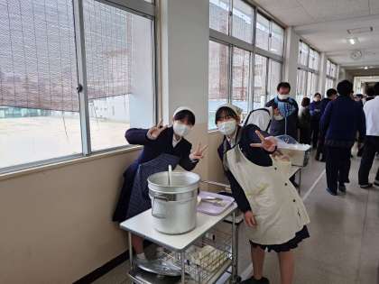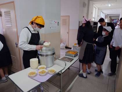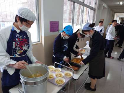 お昼休みのチャイムが鳴り、3年生の皆さんが給食の配食中。今日は「豆腐のミートグラタン・ジャガイモと野菜のスープ・はっさく」の洋風メニュー。鶏と野菜がゴロゴロ入ったスープは身体が温まりますね。今日は寒いのでよければお替りしてください。